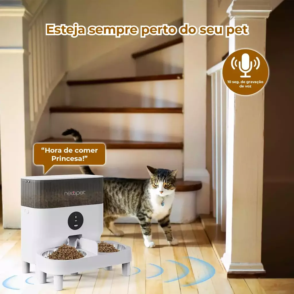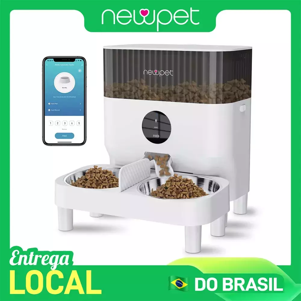 O Newpet Dispensador Automático de Ração possui tigelas duplas bidirecionais, controle remoto via Tuya APP Wi-Fi e gravador de voz para chamar seu pet na hora da refeição. Ideal para cães e gatos, permite programar horários, controlar por aplicativo e garantir que seu amigo nunca fique sem comida.