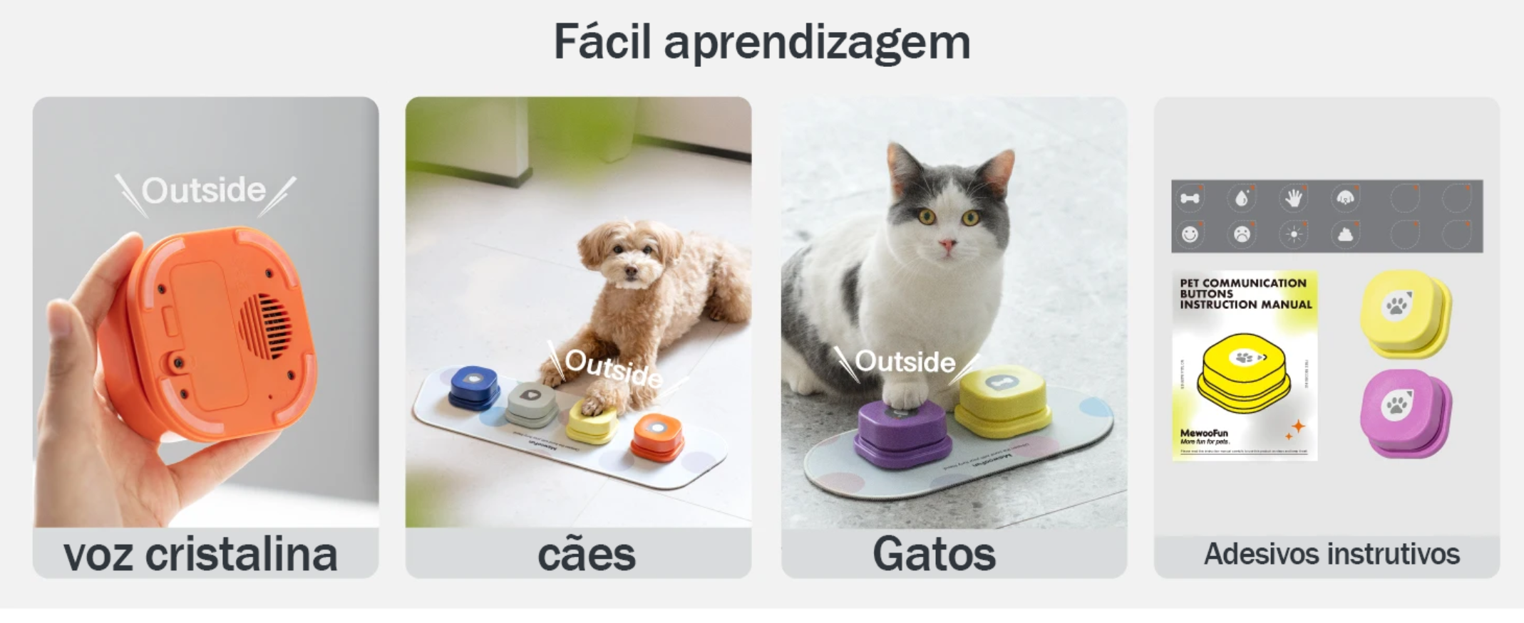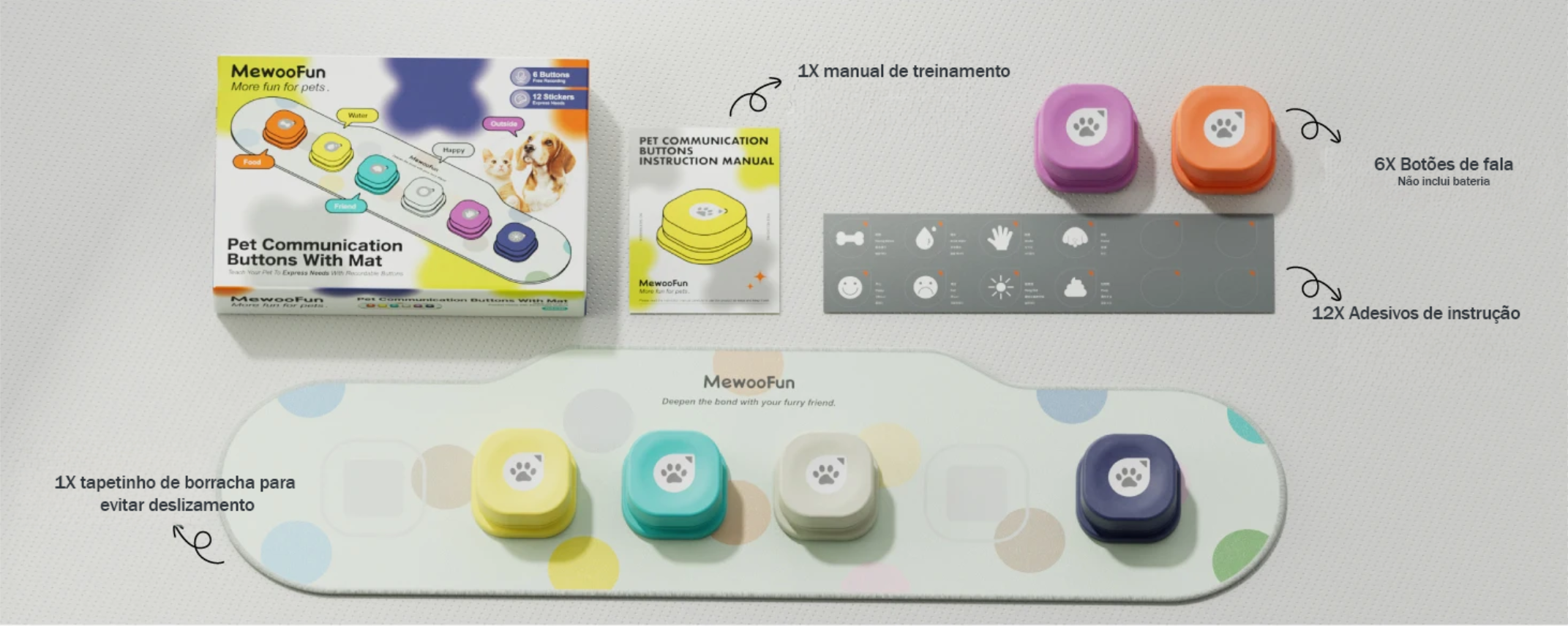Com as cores vibrantes QS02D e QS02C, os botões Mewoofun são perfeitos para criar comandos personalizados como "água", "comida", "brincar", "passear", entre outros. É só pressionar para gravar sua voz e deixar que seu pet descubra como interagir com você — reforçando hábitos positivos e promovendo um vínculo ainda mais forte entre vocês.